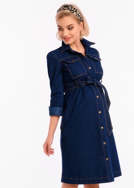 Джинсовое платье для беременных синего цвета длиной до колен. Рубашечный воротник, планка во всю длину на кнопках, длинные рукава на манжетах. Накладные карманы с клапанами на груди, карманы в боковых швах, тканевый пояс в тон, который можно заменить на любой другой. Платье для будущих мам подойдет на всем сроке беременности и после родов.
