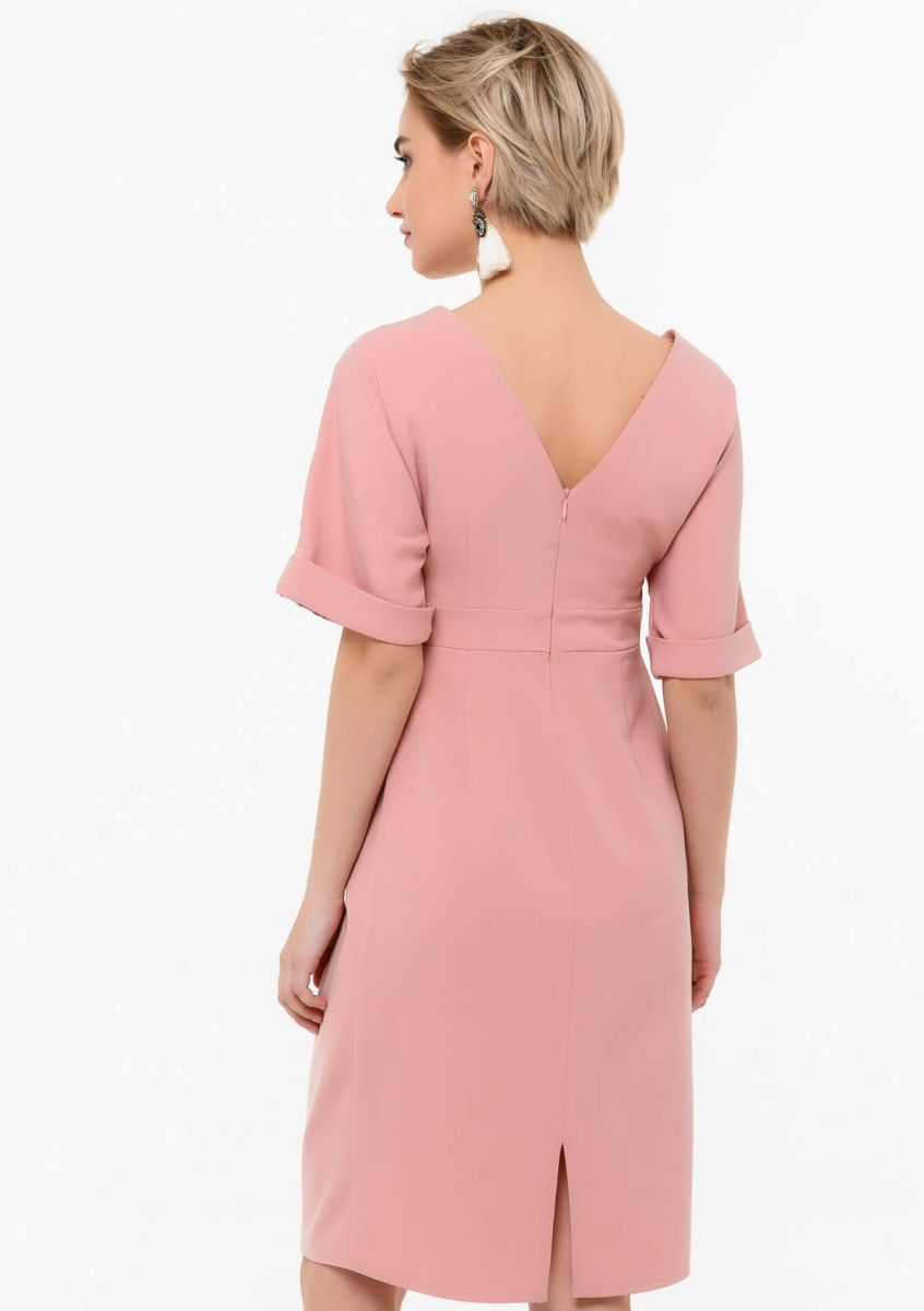 Элегантное розовое платье для беременных и кормящих длиной до колен. Модель с «секретом кормления» в районе груди. Круглый неглубокий вырез плавно переходит на спинку с застежкой-молнией и приобретает v-образную форму.