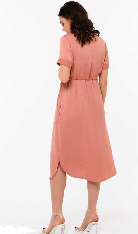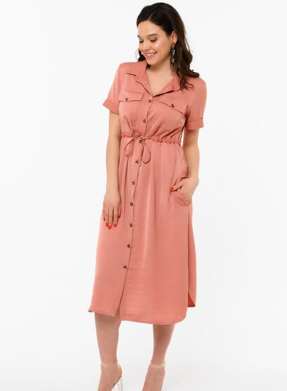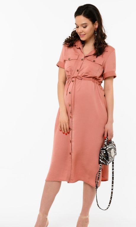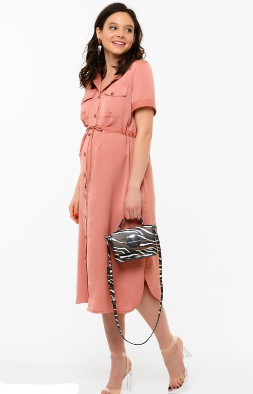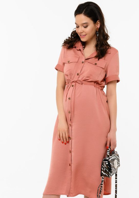 Летнее платье выполнено в стилистике «сафари», с характерными для этого направления деталями. Рубашечный воротник и планка-застежка на пуговицах, большие карманы с клапанами, аккуратные рукава и кулиска по талии – стильный крой гармонично поддерживается светлым, но выразительным терракотовым оттенком ткани. Материал легкий, хорошо пропускает воздух, не дает телу перегреться. Модель идеальна для прогулок в жаркий день, она без проблем комбинируется с разной обувью – от полуспортивных до элегантных женственных фасонов. За счет прямого кроя и возможности регулировать объем, платье можно носить и после появления малыша, оно будет также отлично сидеть по фигуре.