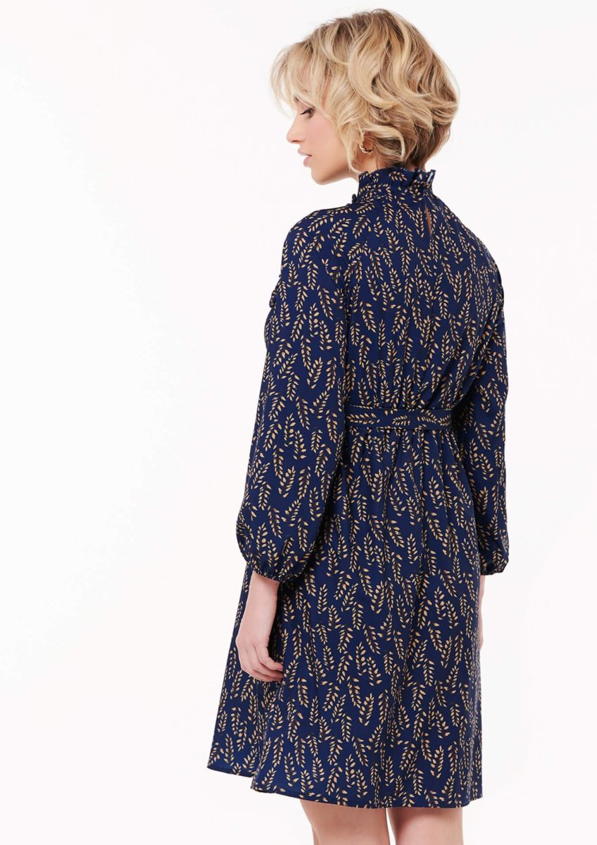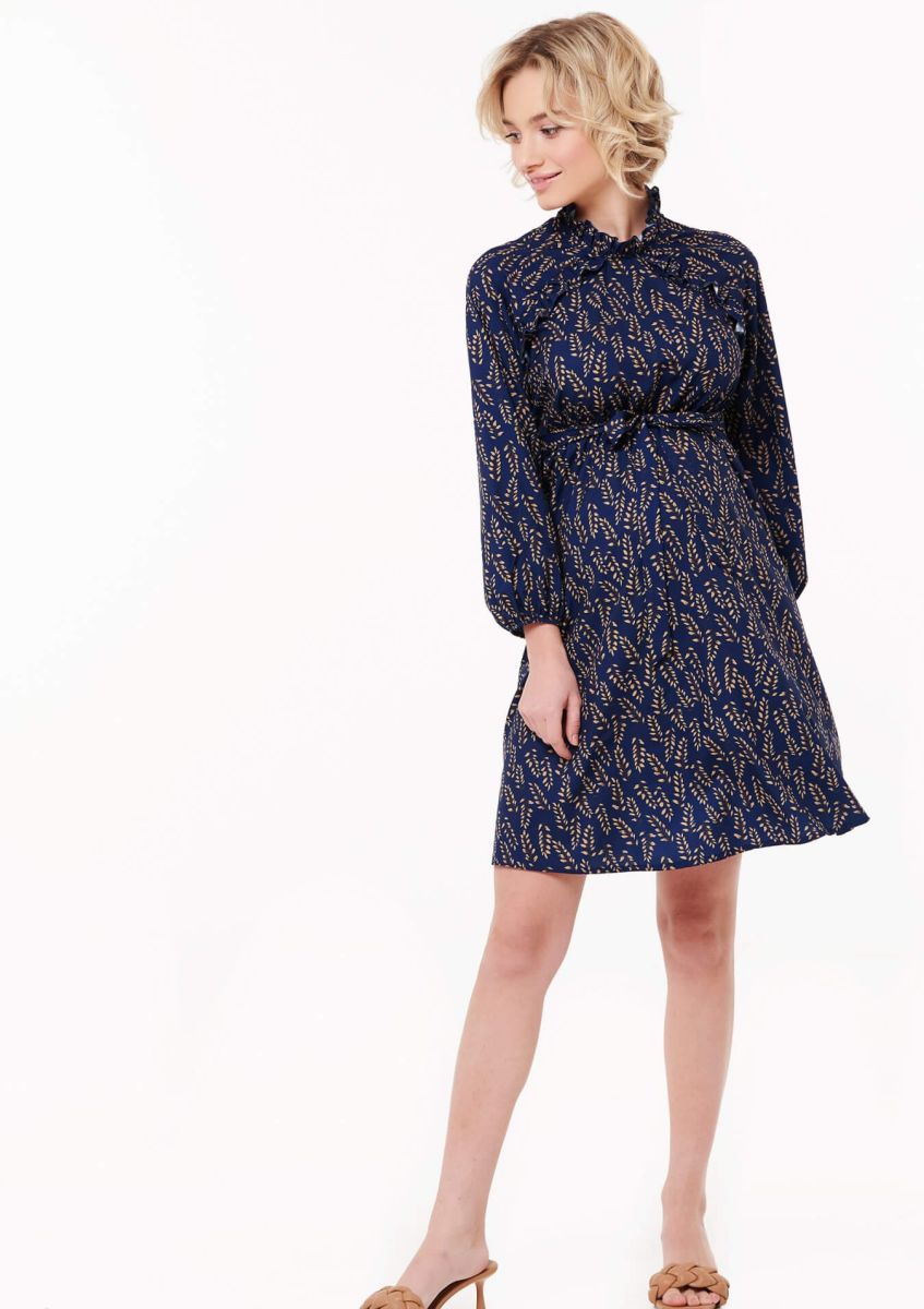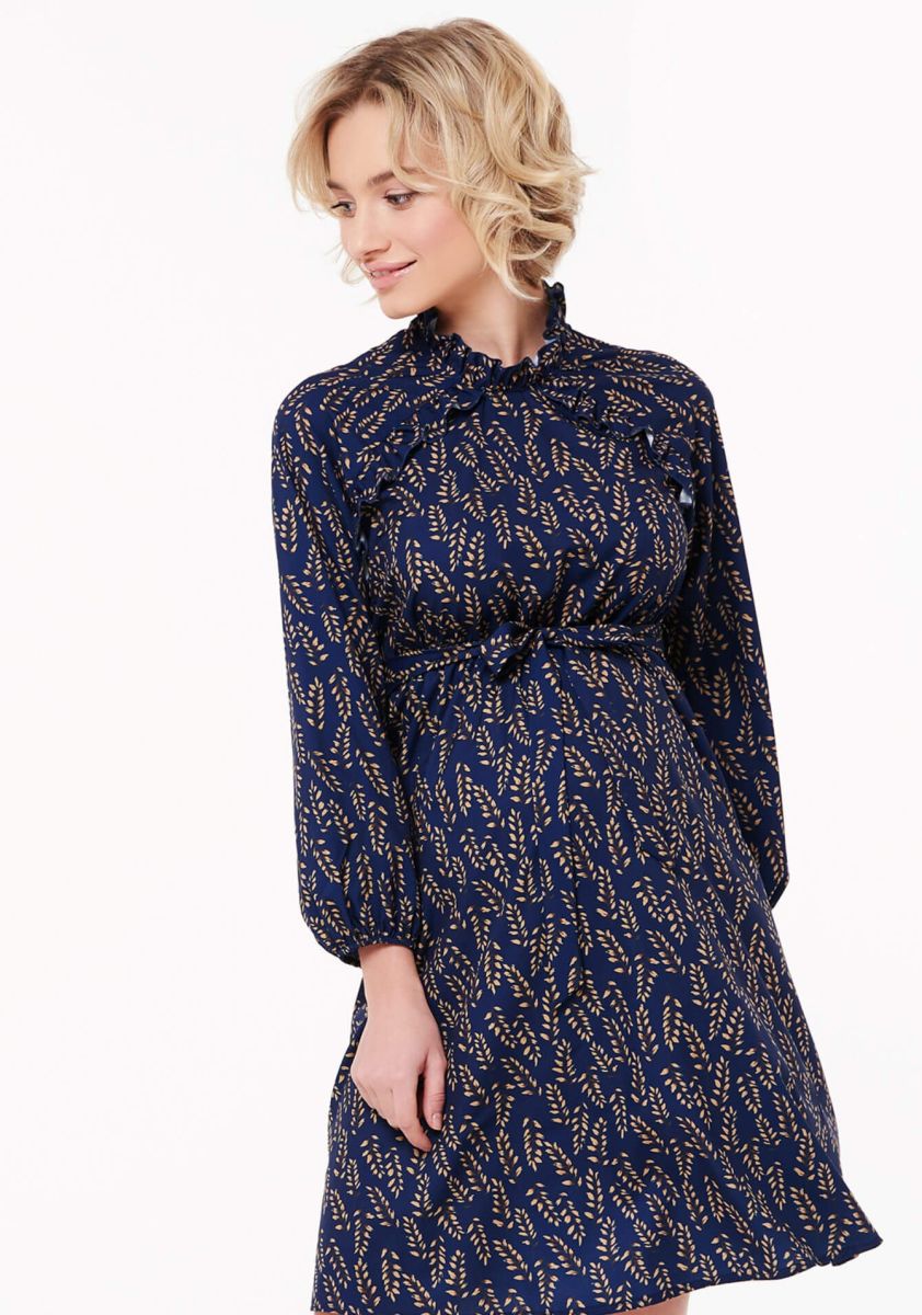Платье для беременных нарядное насыщенного синего цвета с контрастным растительным рисунком длиной до колен.