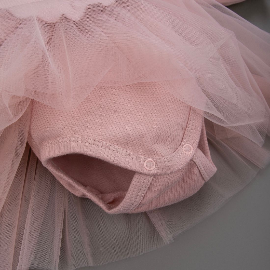 Кнопки на плече и в районе ног на боди помогут быстро одеть платье на малышку.
