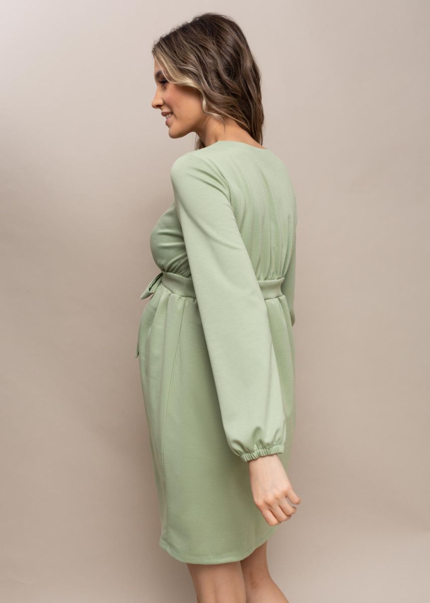 Особенности декора: мягкие сборки на линии талии, не широкий втачной пояс с бантом, резинки по низу рукавов.