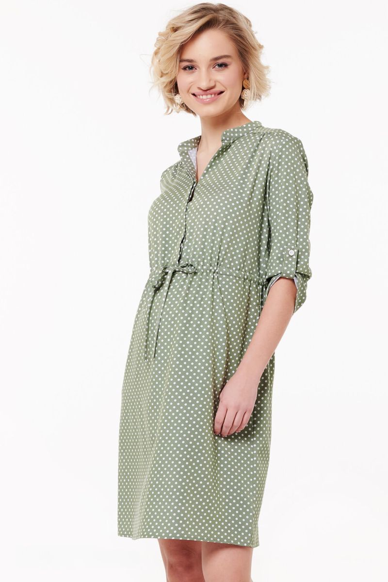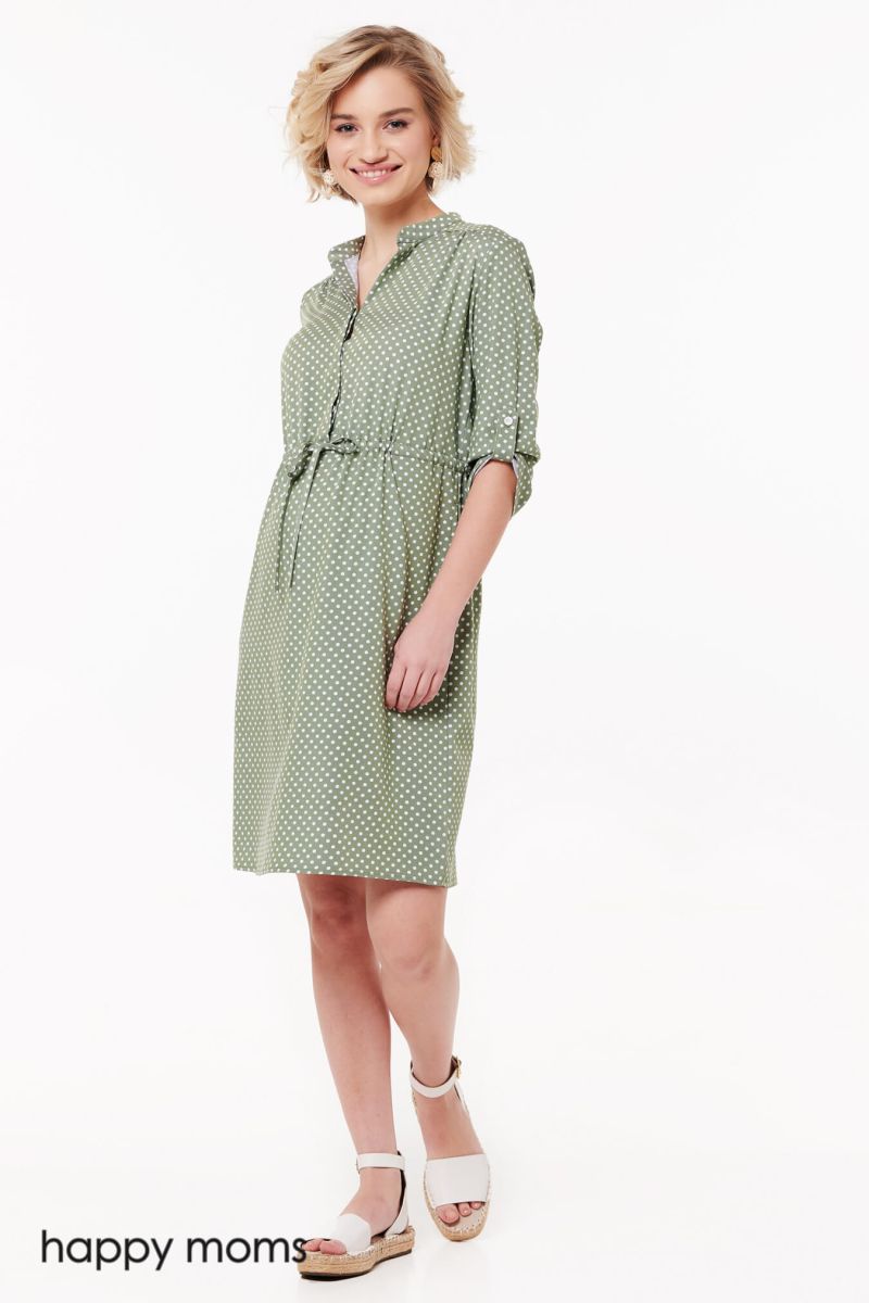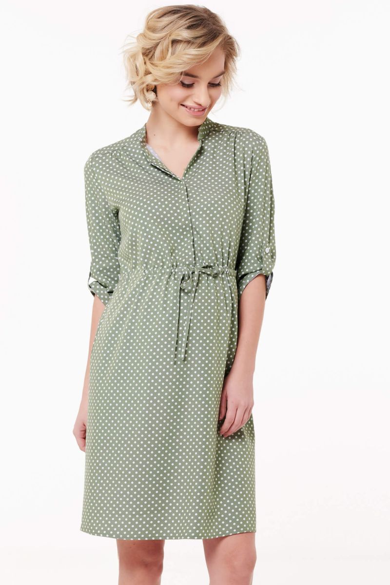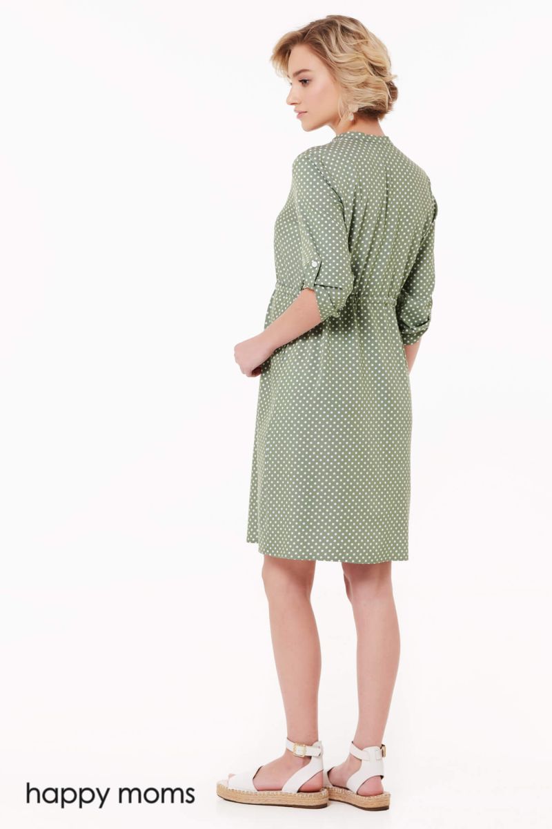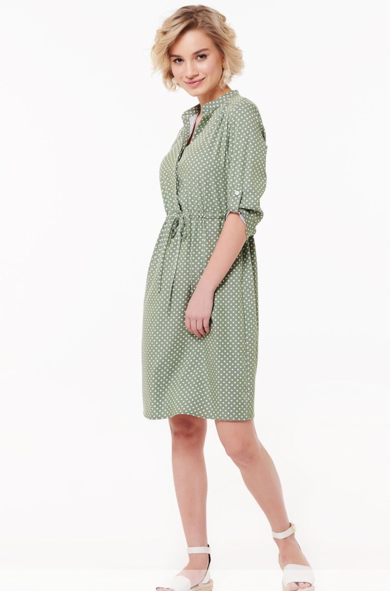 Воротник-стойка переходит в планку с потайными пуговицами. Благодаря этому модель можно использовать как платье для кормления грудью. Кулиска на талии позволяет корректировать объем модели. В результате платье для будущих мам подойдет на любом сроке беременности и после родов.