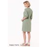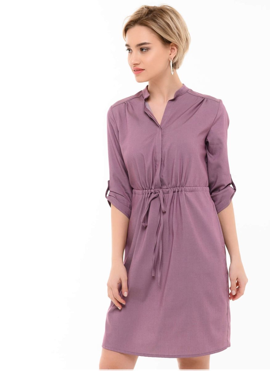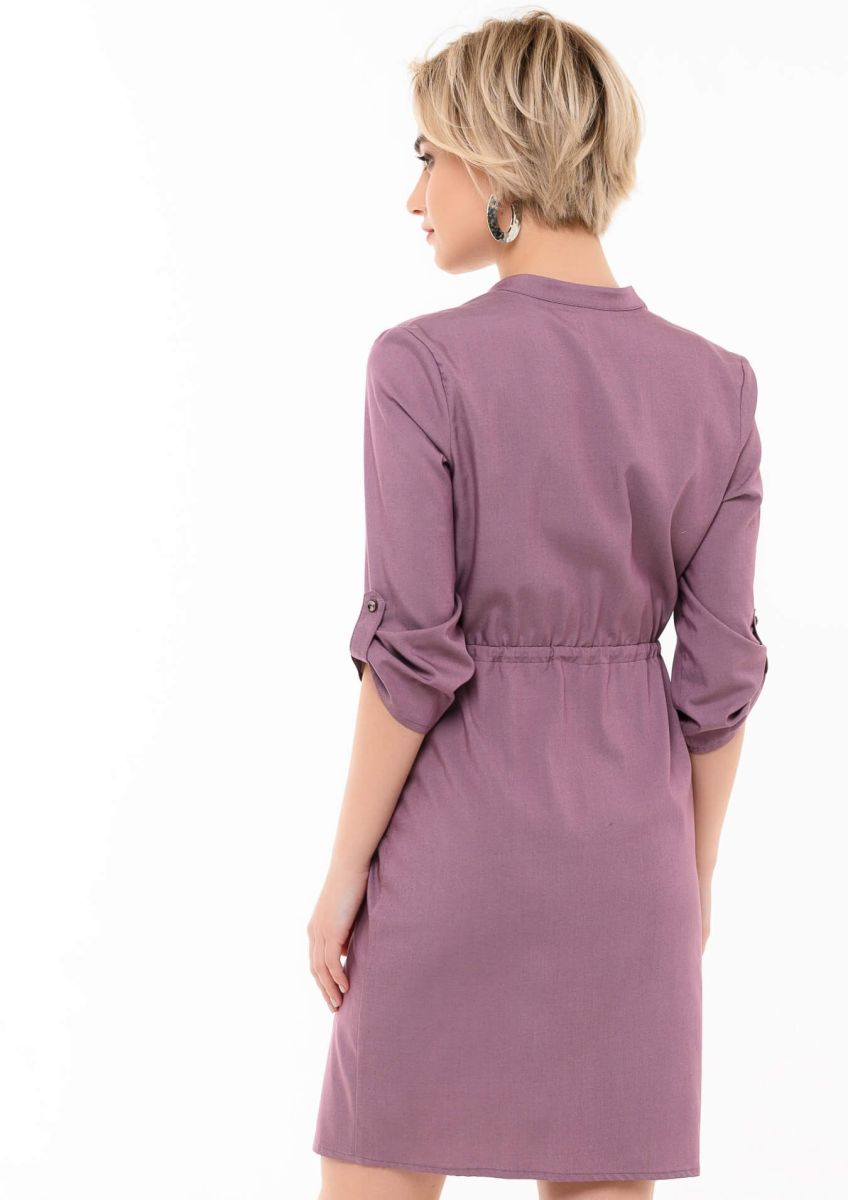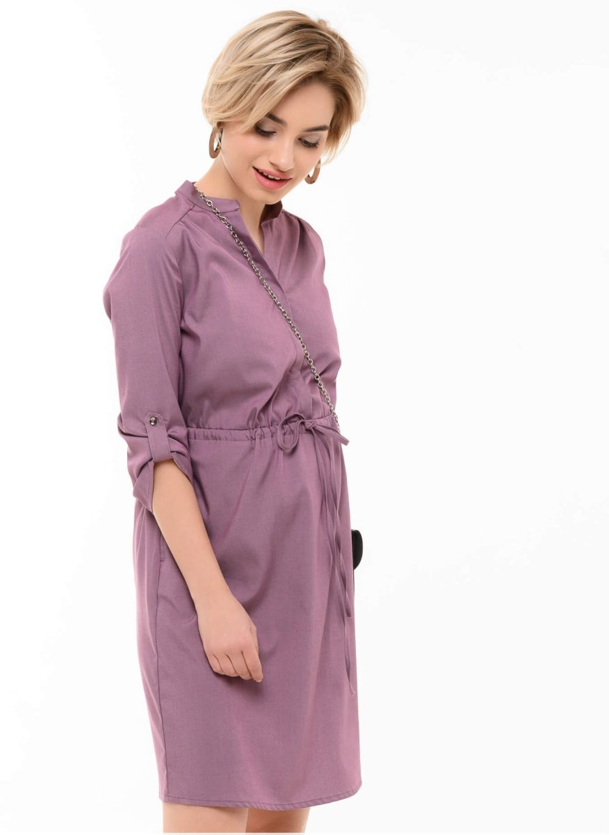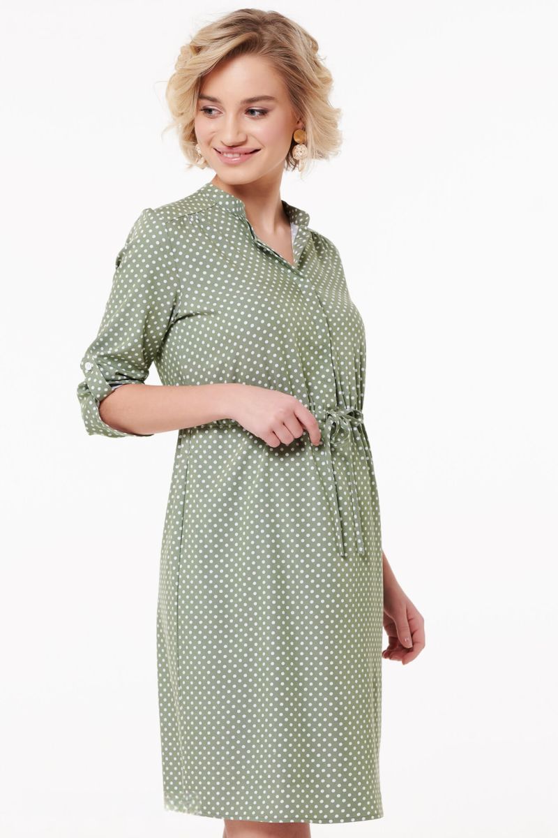 Воротник-стойка переходит в планку с потайными пуговицами. Благодаря этому модель можно использовать как платье для кормления грудью. Кулиска на талии позволяет корректировать объем модели. В результате платье для будущих мам подойдет на любом сроке беременности и после родов.