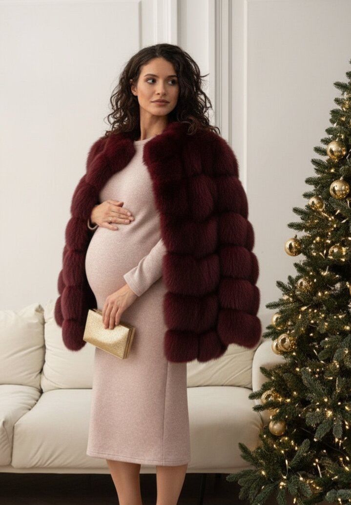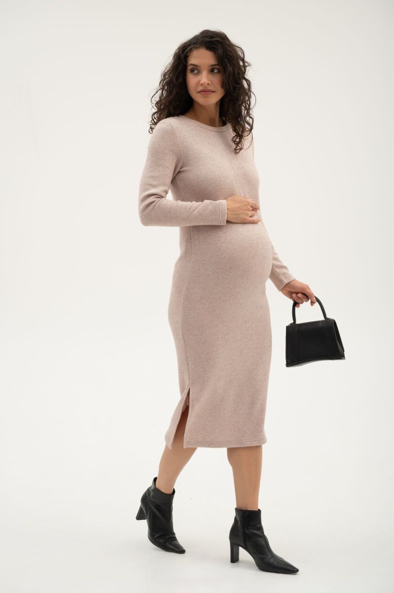Платье прямого полуприлегающего силуэта для беременных. Сбоку разрез для удобства при шаге. Выполнено из плотного, эластичного, вязаного трикотажа с люрексом, который придаёт платью праздничный вид. Деликатный, мягкий блеск и не осыпается, не колется.