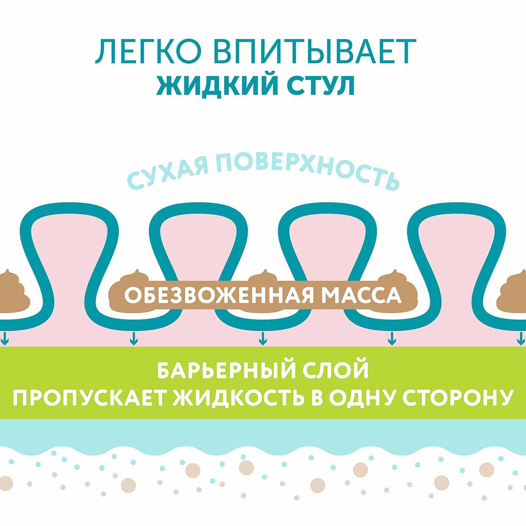 Боковые увеличенные бортики с системой двойного захвата жидкости обеспечивают использование подгузника без протечек. Невесомый древесный пух впитывающего слоя делает подгузник легким, как перышко и мягким, как облачко.