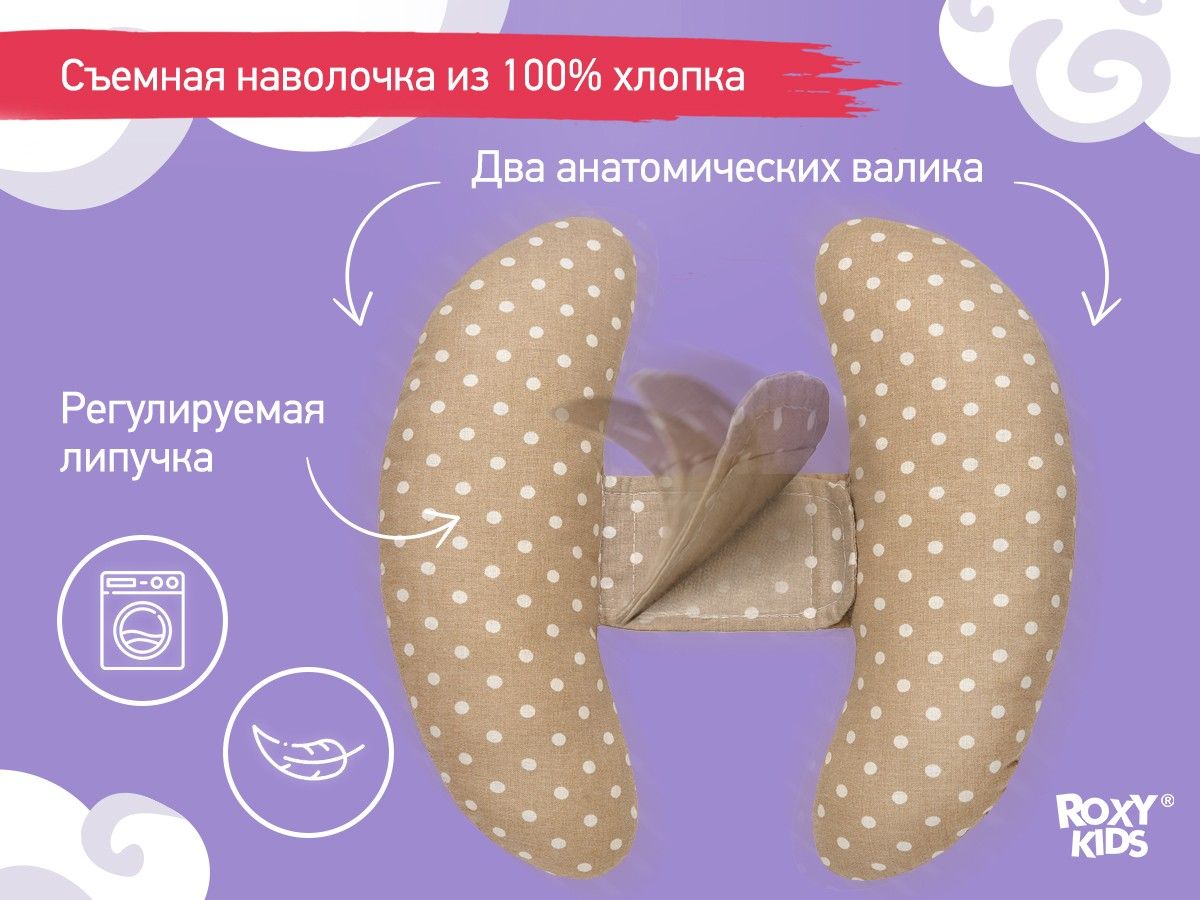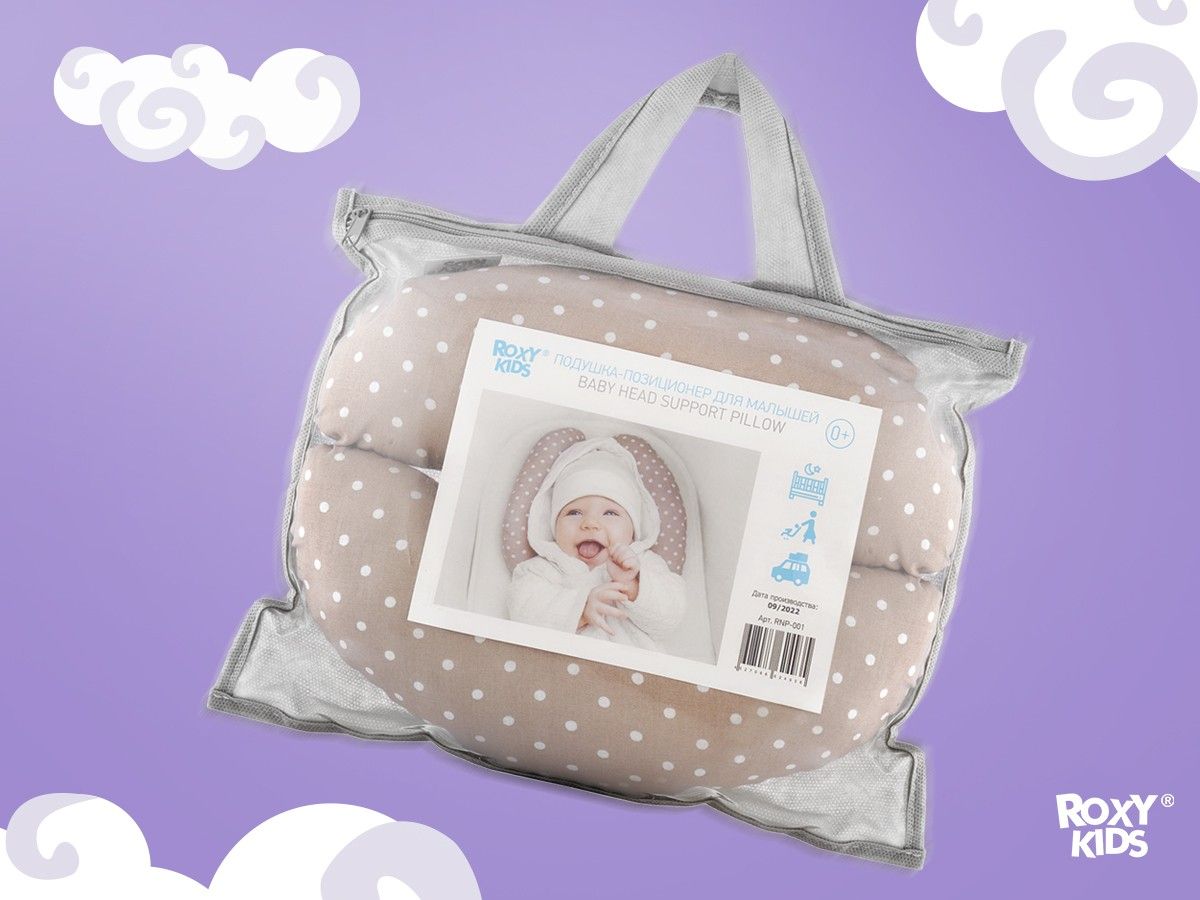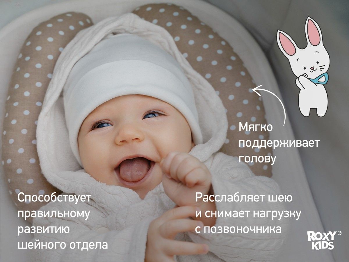 Подушка-позиционер для новорожденных ROXY-KIDS представляет собой два валика, соединенных липучкой, которые мягко поддерживают голову малыша.
