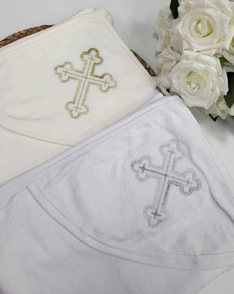 Полотенце для крещения с уголком махровое. Размер изделия: 90х120 см. Большое полотенце изготовлено из качественной хлопчатобумажной махровой ткани. По краю окантовано трикотажной лентой. На капюшоне-уголке вышит декоративными металлизированными нитями большой крест. Отлично впитывает влагу.