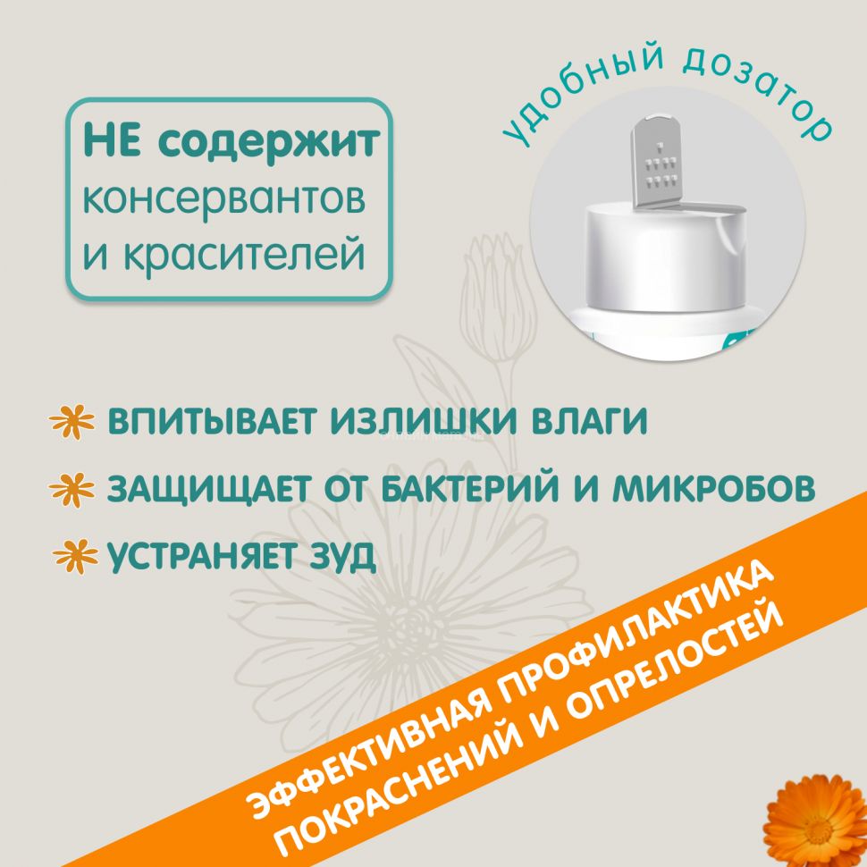 Присыпка отлично впитывает влагу, поддерживает естественный уровень pH. Предохраняет от трения нежную и уязвимую кожу ребенка. Экстракт календулы, входящий в состав продукта, обладает антисептическим, бактерицидным и противовоспалительным действиями, а также снижает аллергические проявления.