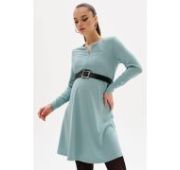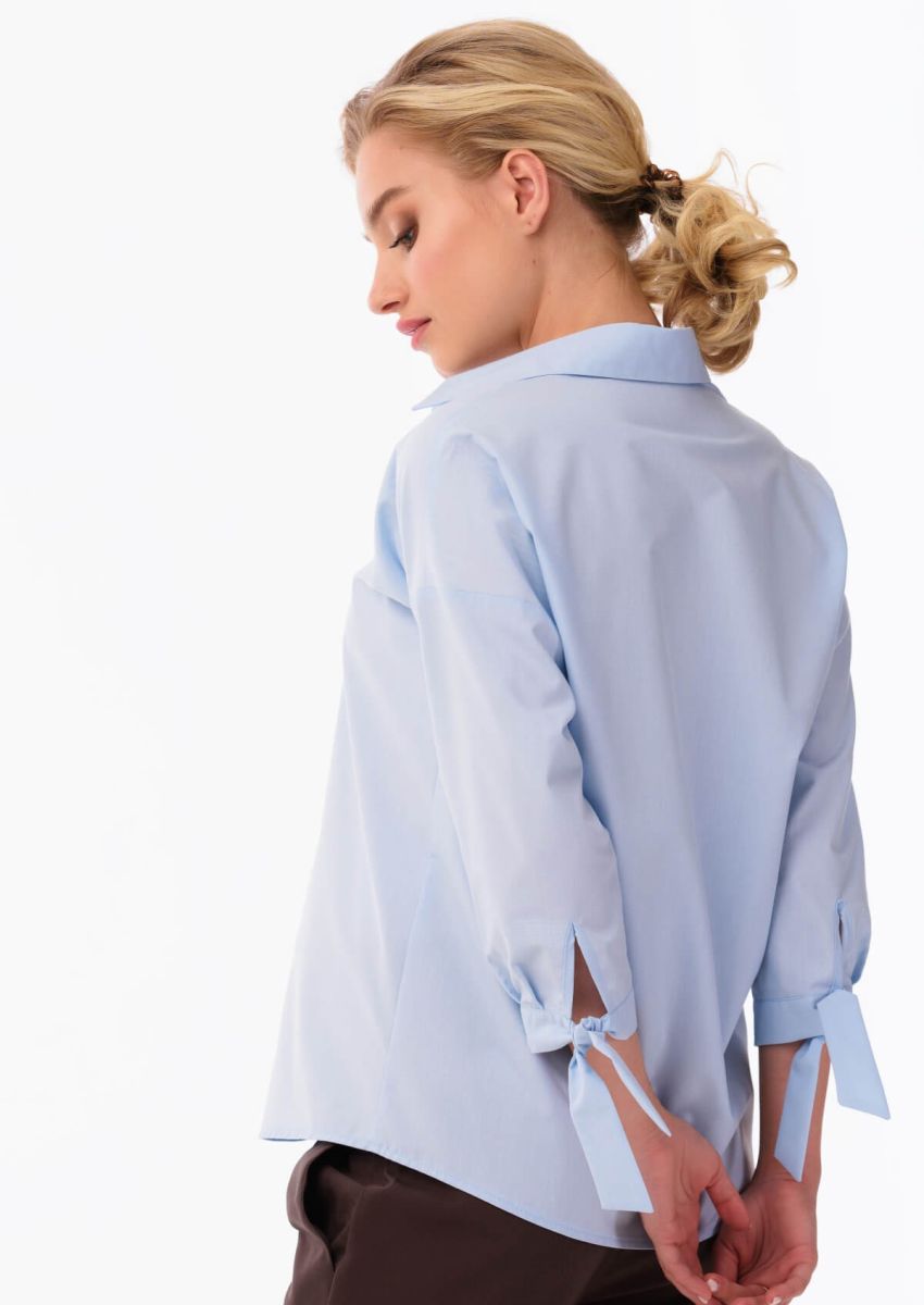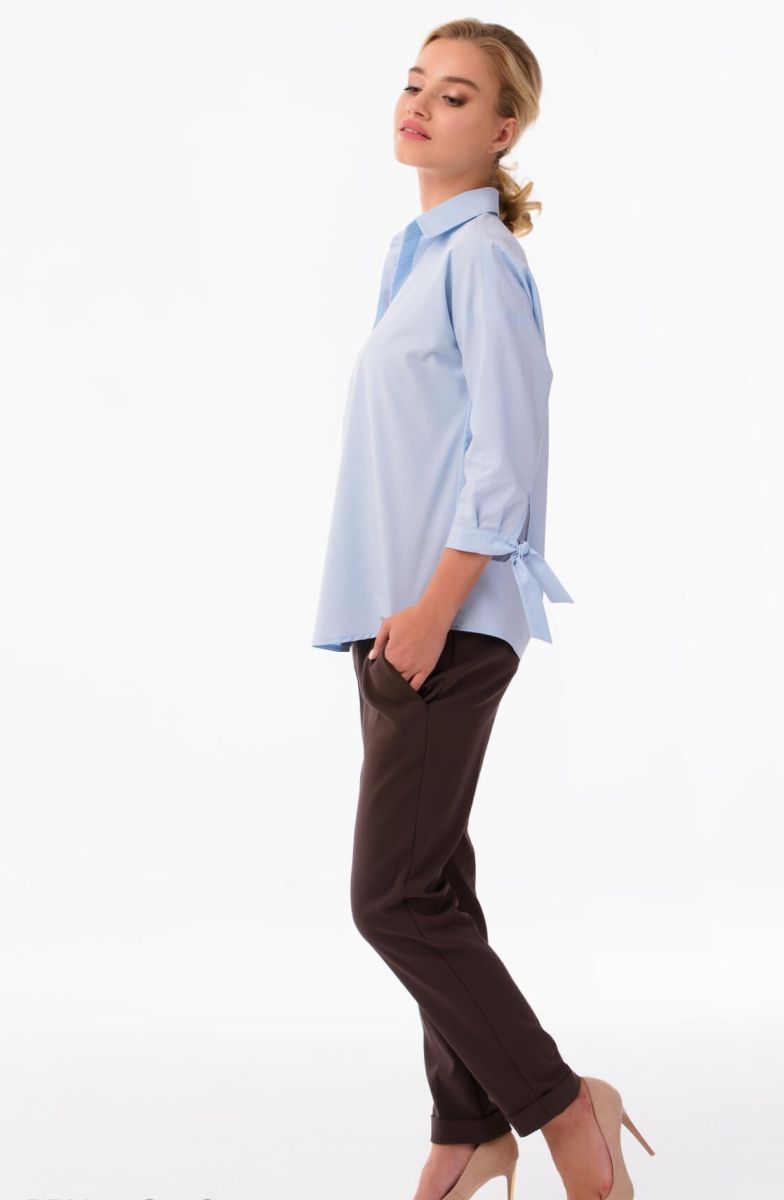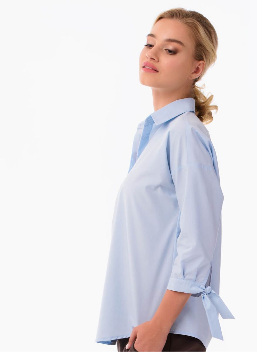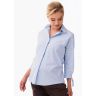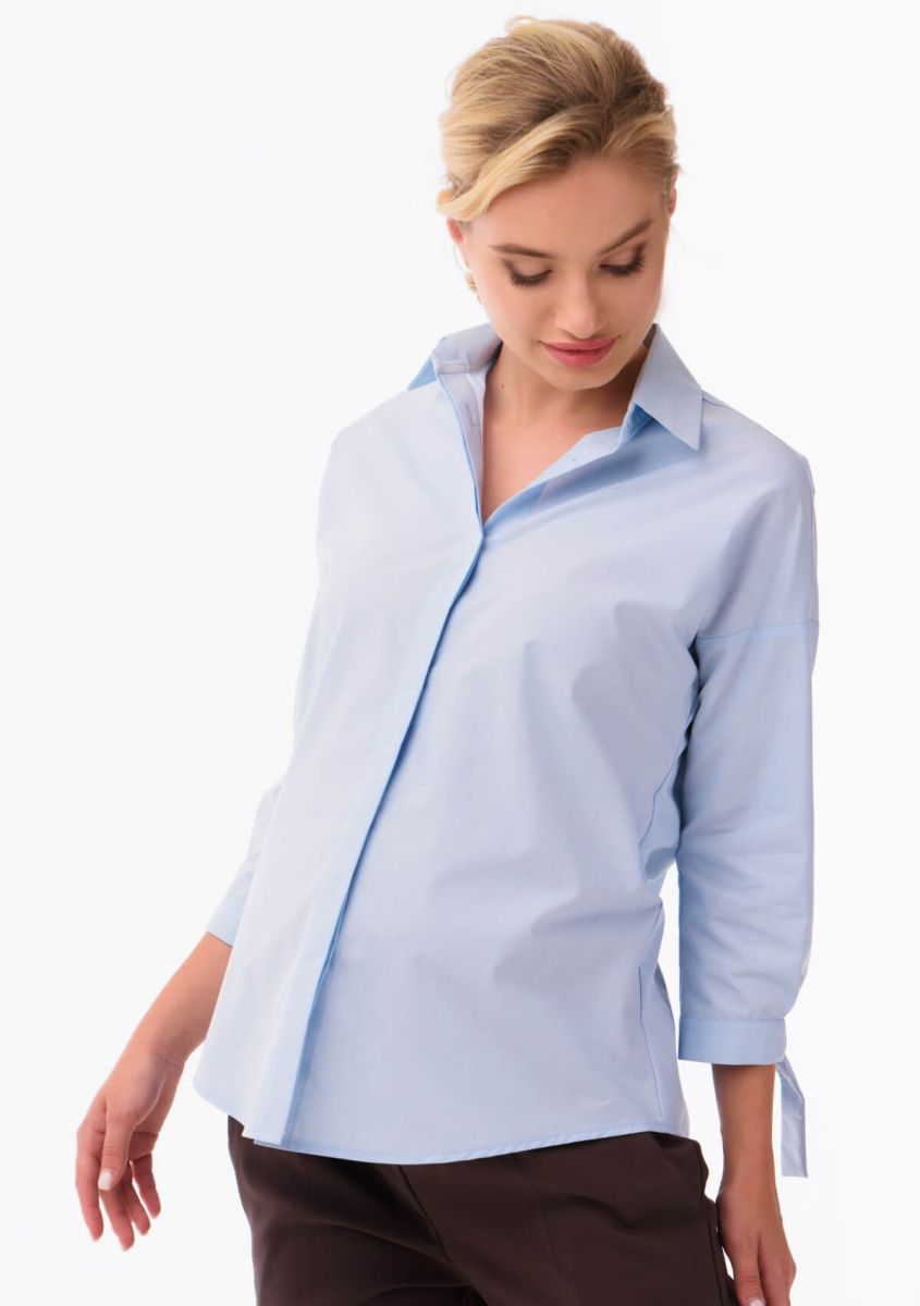 Рубашка для беременных женщин голубого цвета с фигурным низом. Рубашечный воротник переходит в планку на потайных пуговицах. Линия плеча приспущена, рукава 3/4 заканчиваются манжетой в виде завязок.