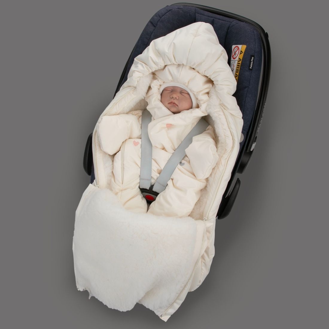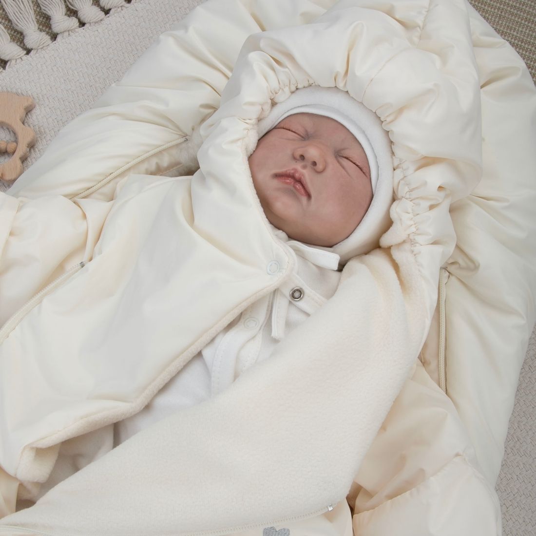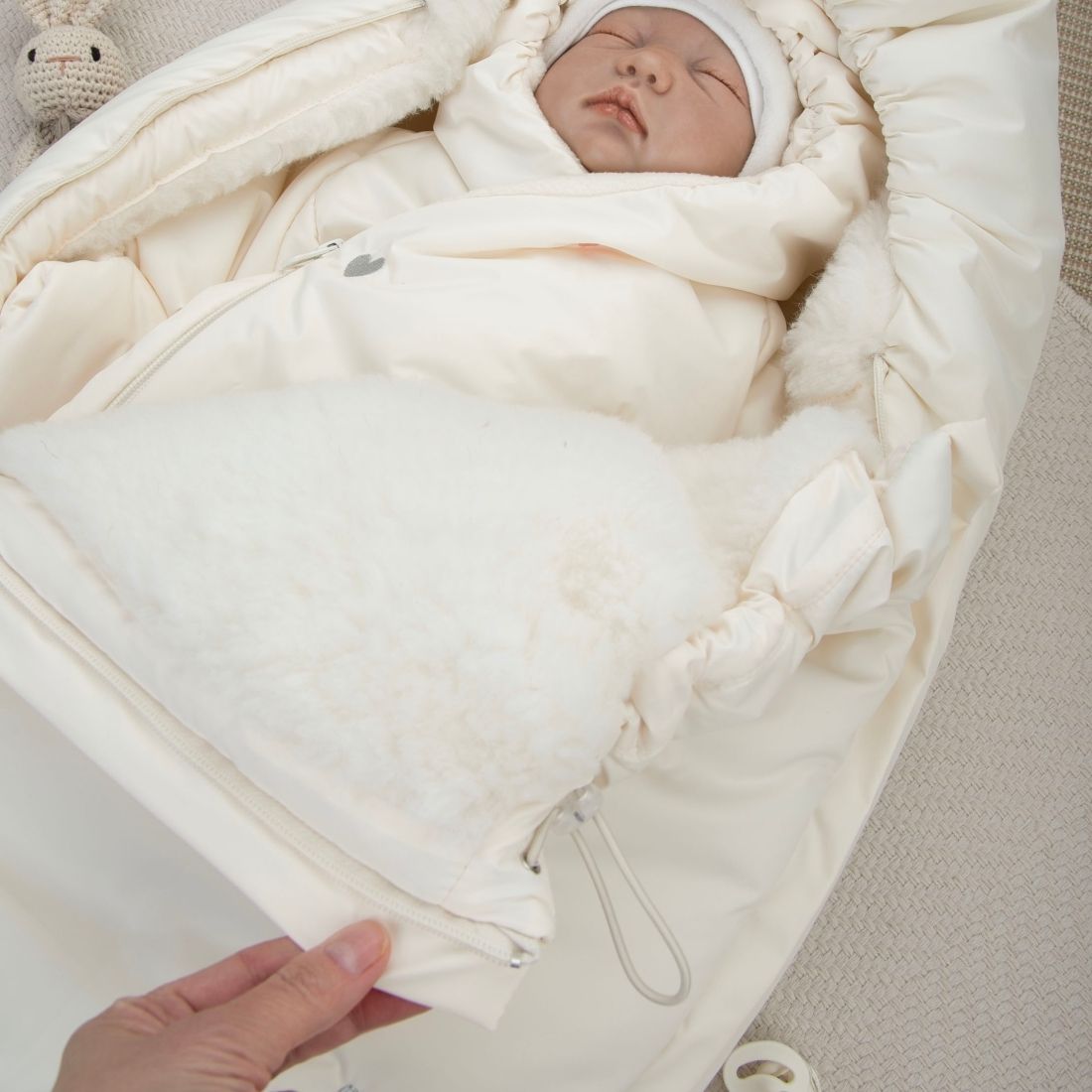 Конверта: ткань верха - непромокаемая ткань Fitsystem style (п/э 100%), наполнитель – синтепон 200 г/м2 (п/э 100%), подклад – овечья шерсть + искусственный мех (70% мех, 30% п/э)