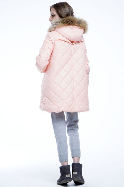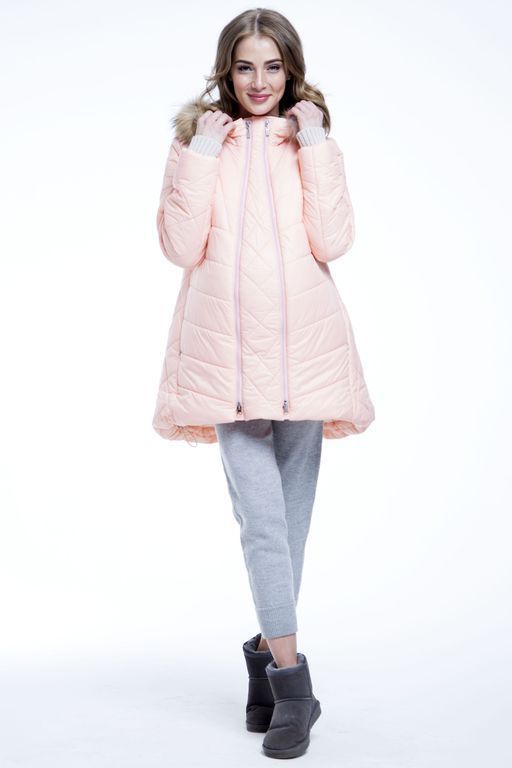 Куртка А-образного силуэта с асимметричным низом. Удлиненная спинка. Цветовая гамма выбранная для создания этой модели включает в себя нежно персиковый и желтый, классический синий цвета. Для большего комфорта и защиты от холода под животом выполнен пояс из вязаного трикотажа, который визуально напоминает выглядывающий из-под одежды уютный свитер и на рукавах использованы вязаные манжеты. Куртка универсальна и с легкостью может носиться на любом сроке беременности за счет вставки на молнии, а так же без использования вставки после рождения ребенка. На капюшоне пристегивающийся на кнопки натуральный мех финского енота.